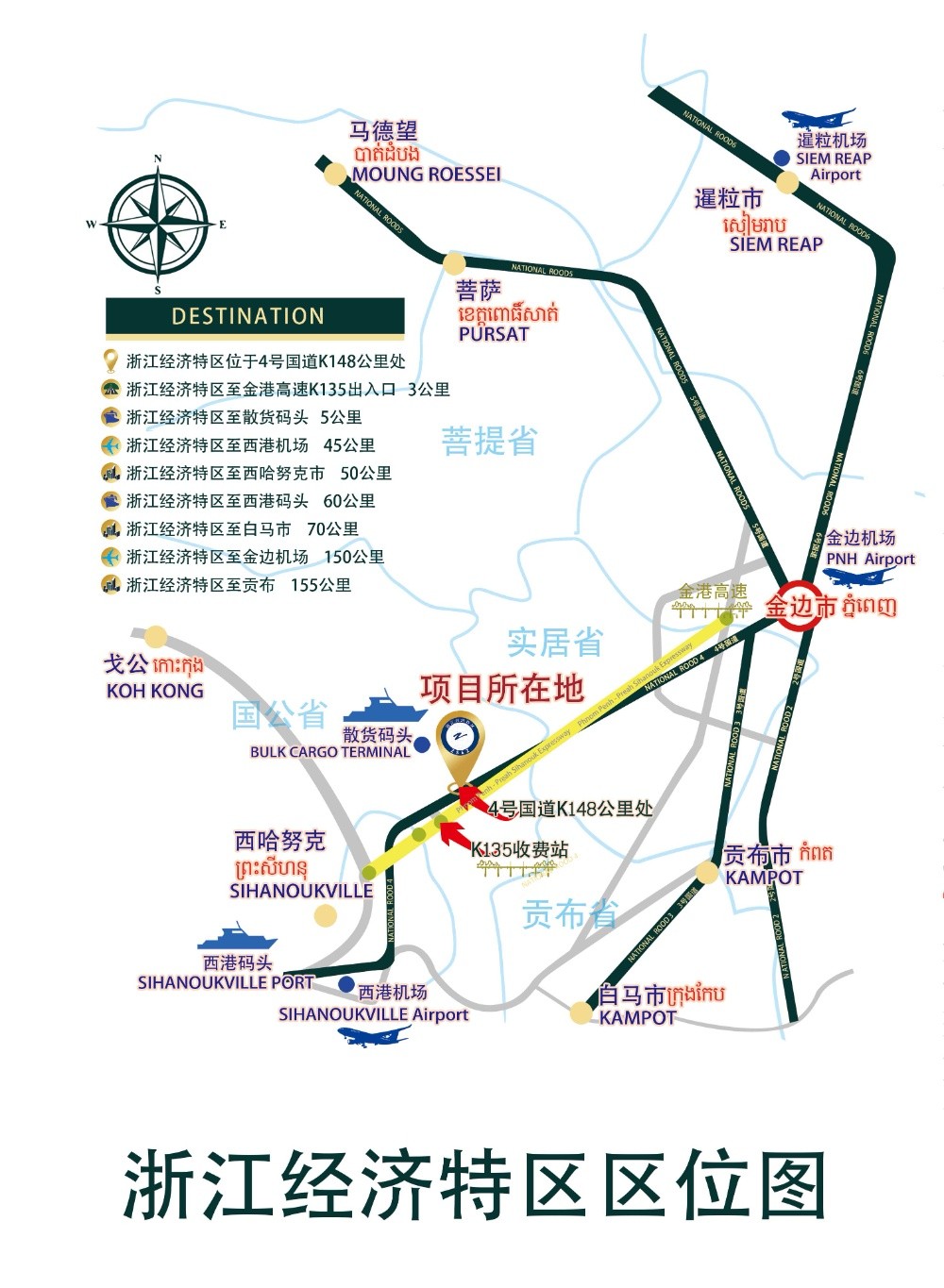 浙江經(jīng)濟特區(qū)二期是繼一期全面完成招商并成功營運基礎(chǔ)上又設(shè)立的新特區(qū)。二期位于4號國道K148,緊挨金港高速135KM出口,占地935公頃,二期規(guī)劃重工業(yè)區(qū)、化工區(qū)、輕工業(yè)區(qū)以及柬埔寨政府唯一特許的“園中園區(qū),致力打造東南亞“一帶一路”工業(yè)小鎮(zhèn)典范。