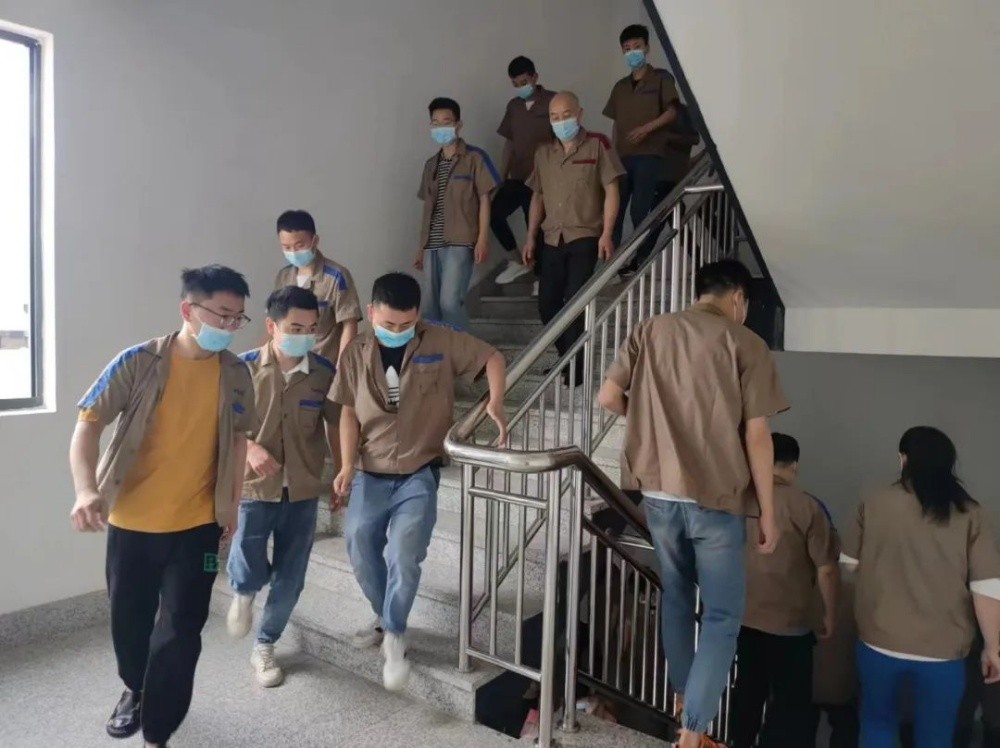 公司領(lǐng)導(dǎo)在得知火場(chǎng)情況后(火警鈴響起),立即作出全部疏散命令,各車(chē)間主任、班組長(zhǎng)有序組織人員通過(guò)疏散逃生通道撤離到“緊急集合點(diǎn)”并及時(shí)清點(diǎn)人員。