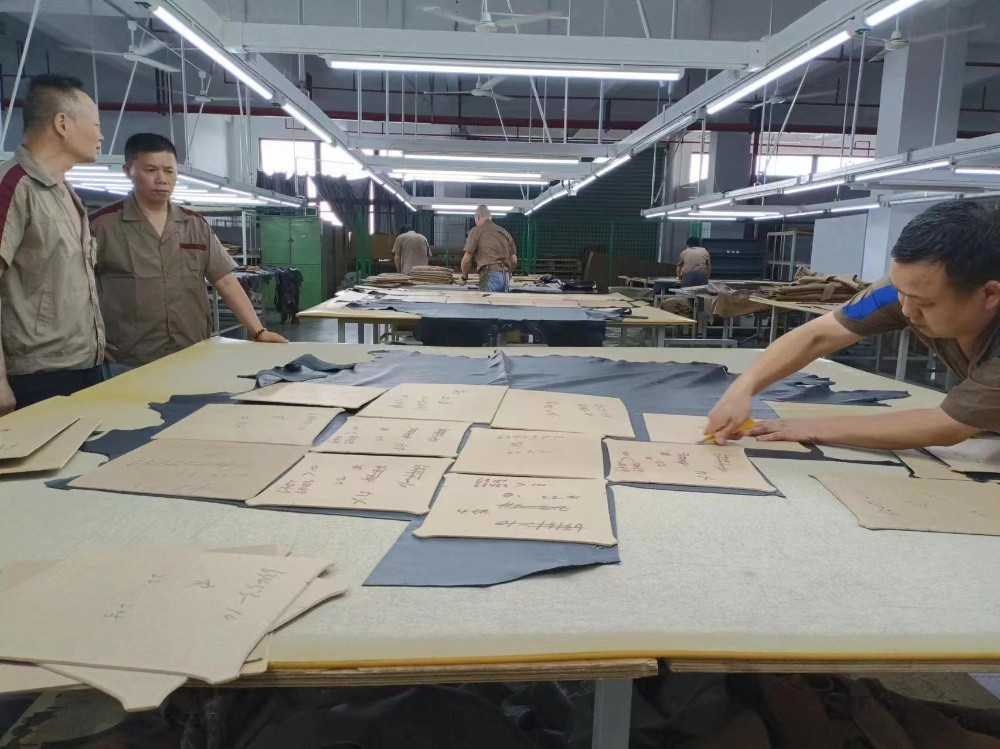 6月13日下午1時裁剪車間也進(jìn)行了激烈比拼,8名一線員工較量63422-10皮1套的裁剪。比賽中選手把皮平攤在桌子上,認(rèn)真地把皮疵點(diǎn)圈出,然后把樣板放皮上,嚴(yán)格按質(zhì)量要求認(rèn)真裁皮。經(jīng)過激烈角逐,范國峰拿下了第一名。